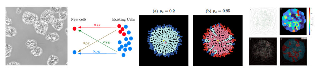 - Para ilustrar nuestro abordaje interdisciplinario, se muestra el camino desde las mamoesferas (modelo biológico tridimensional enriquecido en células madre tumorales de mama) a la izquierda, pasando por modelos matemáticos y computacionales, hasta ser analizadas con estrategias de inteligencia artificial para determinar patrones en la distribución de las células madre tumorales (derecha).